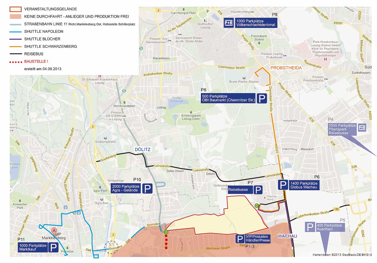 Das Veranstaltungsgelände ist für den Zeitraum der militärhistorischen Darstellung und des Rahmenprogramms am 20.10.2013 weiträumig (Ortslagen Markkleeberg Ost / Wachau) für den privaten Personenverkehr gesperrt. Alle Besucher, die mit ihren privaten Fahrzeugen zum Event anreisen, nutzen bitte die ausgeschilderten P+R Plätze und von dort aus den ÖPNV bzw. bereitstehende Shuttlebusse zum Veranstaltungsort. Den Einwohnern von Leipzig und Markkleeberg empfehlen die Veranstalter aufgrund der angespannten Verkehrslage und aufwendigen Parkplatzsuche auf die öffentlichen Verkehrsmittel umzusteigen. Fußgänger erreichen das Veranstaltungsgelände über die Bornaische Straße Markkleeberg, die Rilkestraße Markkleeberg sowie den Südring Wachau. Bitte folgen Sie der entsprechenden Ausschilderung vor Ort.