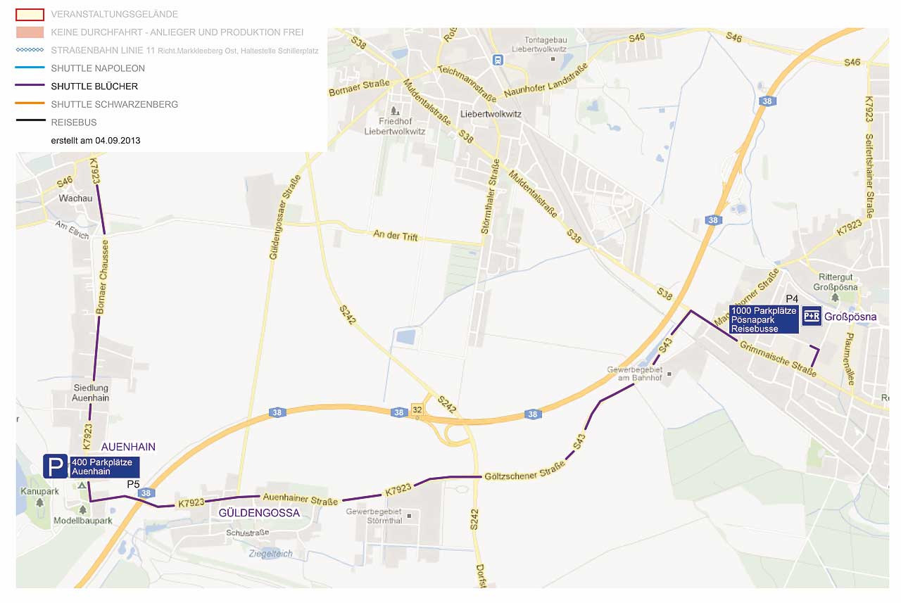 Besucher, die ihr Fahrzeug auf den „1813- Parkplätzen“ abstellen, werden gegen Vorlage des gültigen Parkscheins kostenfrei (max. 4 Personen) mit einem Shuttle (Gelenkbusse der LVB) bis zum Veranstaltungsgelände und auch wieder zurück gebracht.